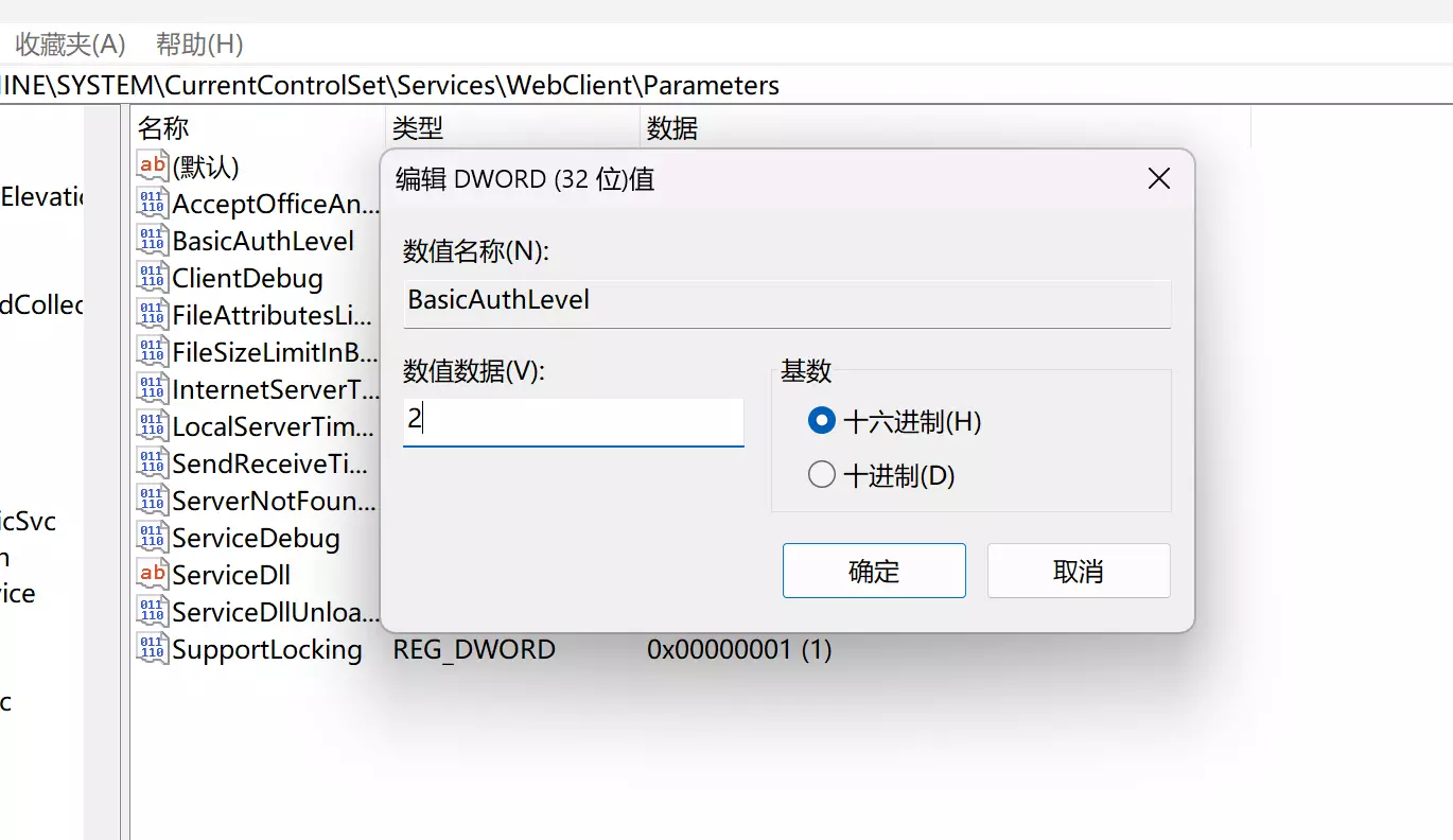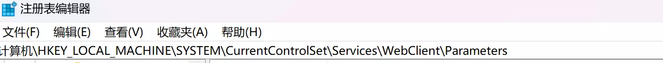 * 找到BasicAuthLevel:在如下位置输入\HKEY_LOCAL_MACHINE\SYSTEM\CurrentControlSet\Services\WebClient\Parameters之后,将会自动定位到BasicAuthLevel.
