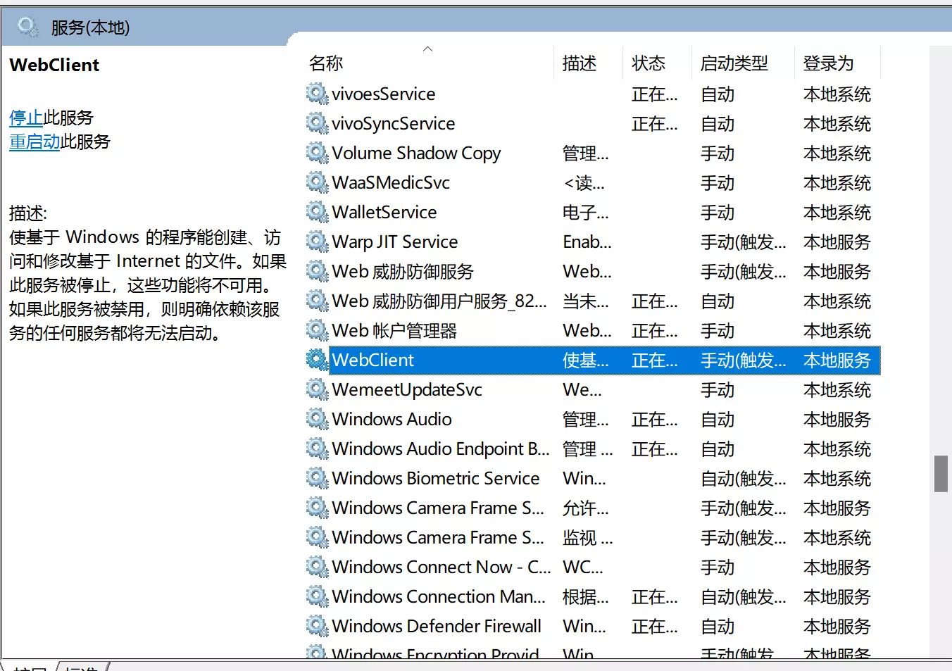 * 重启WebClient:在服务界面找到WebClient,重启即可: