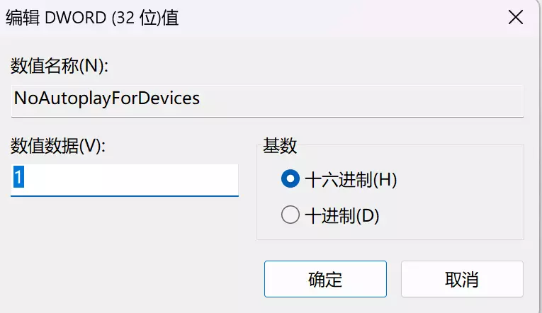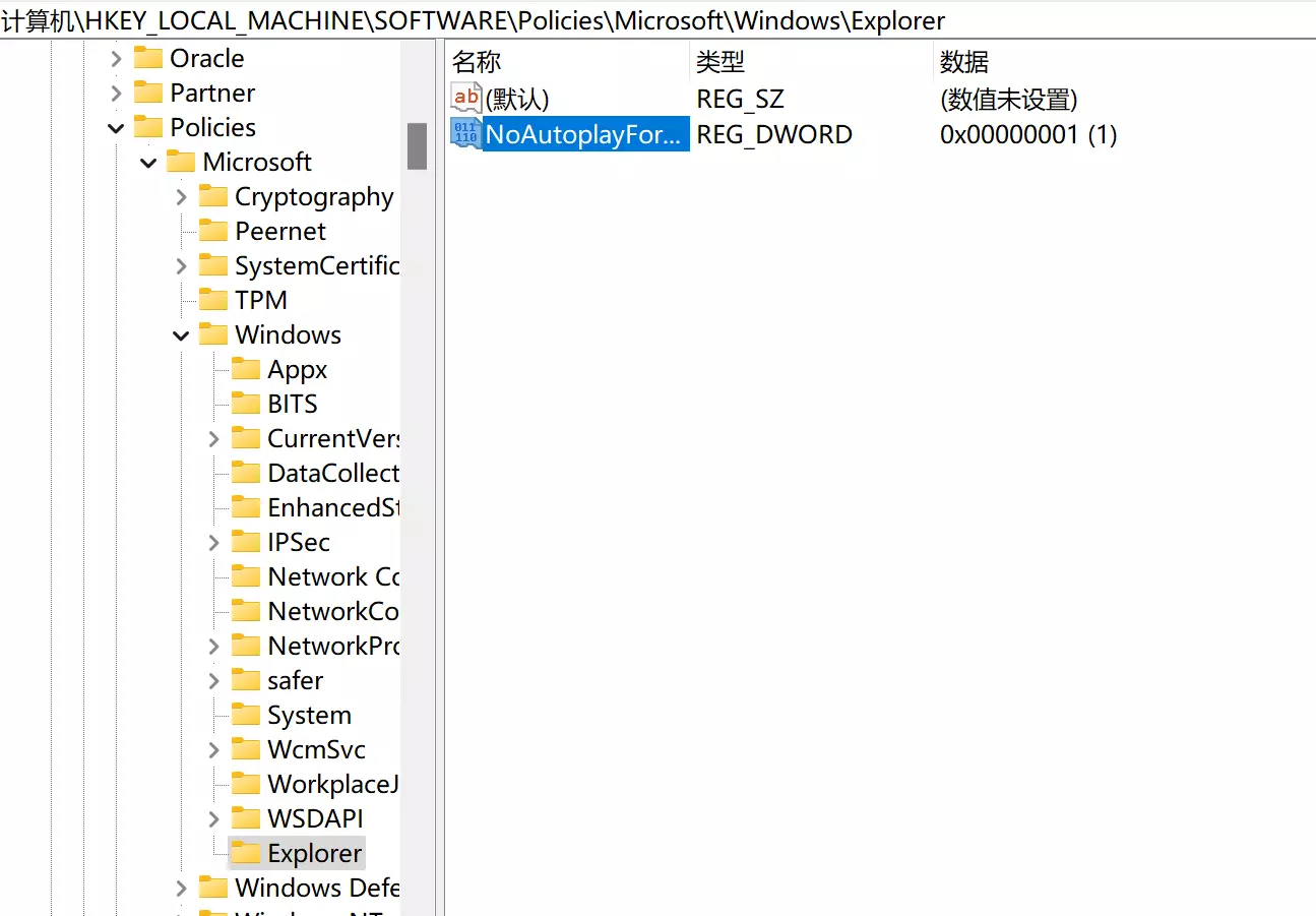 - 右键点击 Explorer 后新建 DWORD (32位) 值 并命名为 NoAutoplayForDevices,之后将该值设置为1即可。