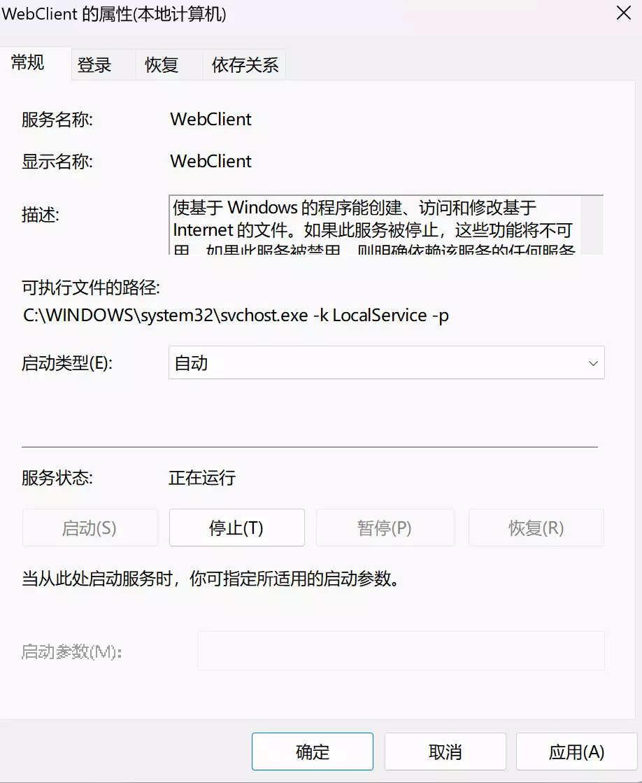 注:这里建议设置自动开启WebClient服务,否则的话,每次打开电脑都需要重新开启该服务,会相对比较麻烦。 具体方法为,右键点击WebClient,选择属性,打开如下窗口:
